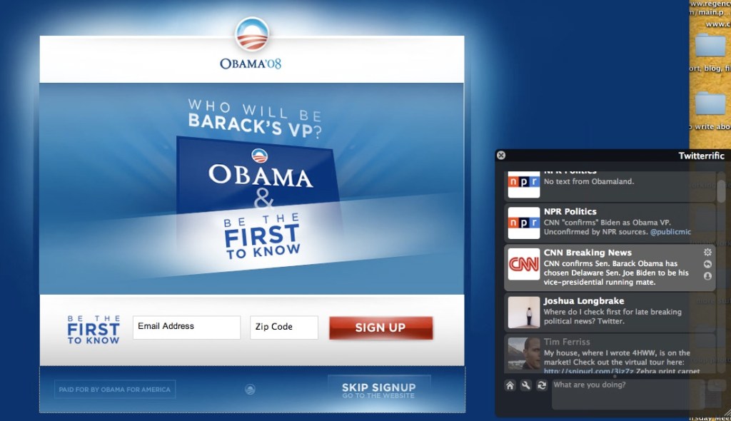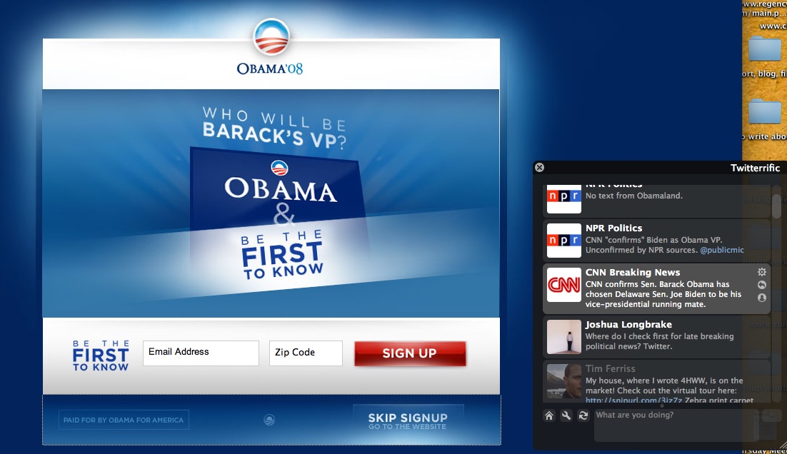 >> Some people don’t get Twitter. I don’t get it sometimes, but I do think it’s a good way to stay connected to some folks. It’s also a great way to exchange ideas. But believe it or not, I also think it’s a great way to get breaking news. It’s old news now, but when Obama’s VP pick showed up on my Twitter feed, I jumped over to his website to learn more. There, they were asking me to sign up to be the first to know.
