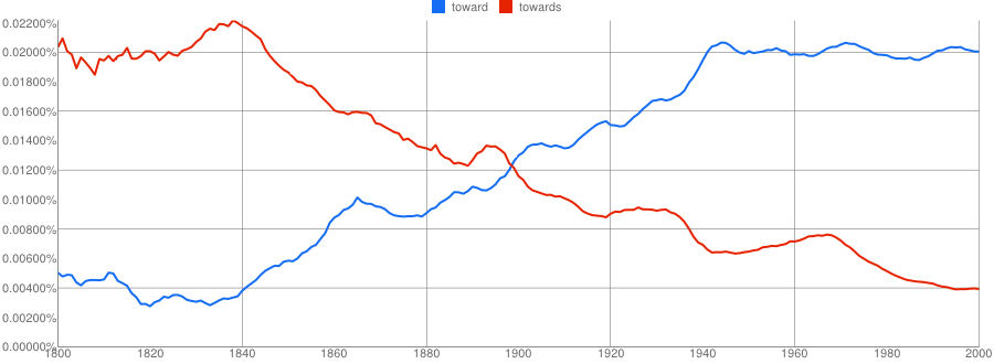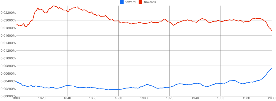 Grammarist backs this up. They write that both are acceptable and share meanings (yes!), but that towards is more common in British writing while toward has gained popularity in American writing (again!). They include these nice charts, courtesy of Google Ngram, that show towards and toward usage in over the past 200 years or so.